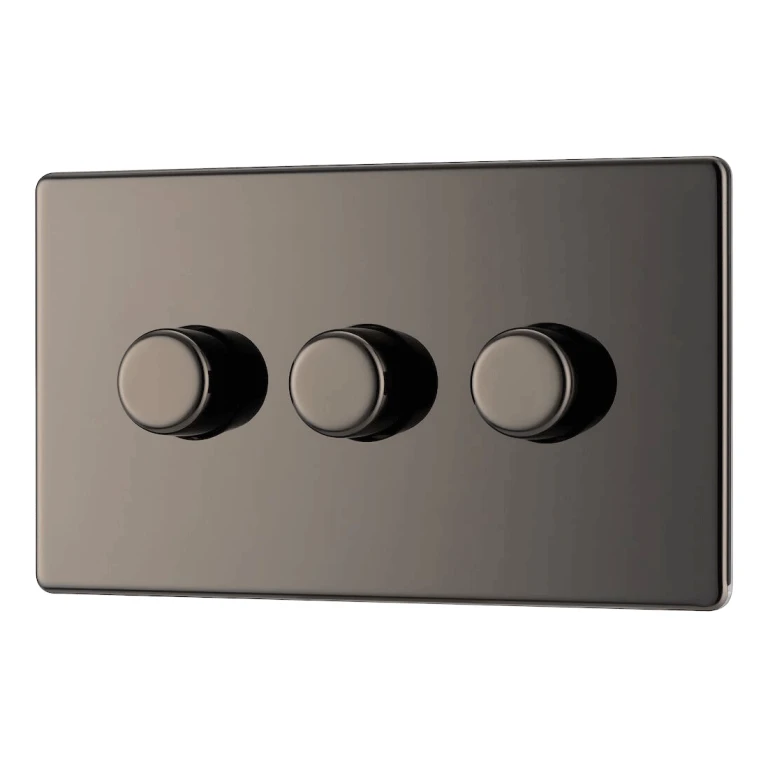 This trailing edge triple dimmer switch from BG allows you to control your light levels and set the mood. The intelligent electronic circuit monitors the connected load and provides a soft-start with protection against thermal, current and voltage overload. Suitable for dimming LED, dimmable CFL’s, and traditional lighting. The screwless clip on/off front plate has a black nickel finish and sits flush against the wall, making it ideal for modern interiors.
