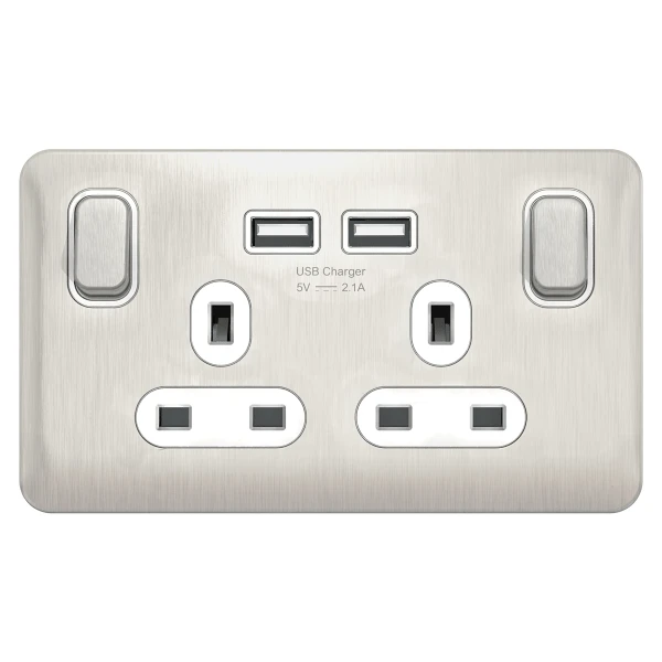 The smooth, modern lines of Lisse Screwless Deco offer an understated elegance to compliment today’s interiors in this double switched power socket with two USB charging ports in a stainless steel finish. You can express your personal sense of style in the home down to the finest detail through the comprehensive range of other finishes and the technical features the USB sockets has to offer.