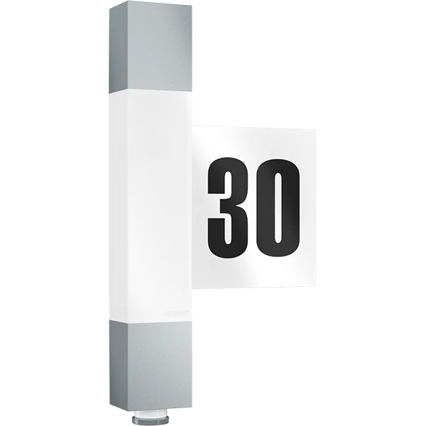 L 630 LED sensor-switched outdoor light with removable infrared mini sensor (360° angle of coverage, 8 m reach) and illuminated house number panel, for mounting on the left or right. Slimline design, intelligent functionality, optimum outdoor illumination (663 lm). With soft light start, basic light level, night economy mode and Nightmatic function. Power consumption of only 8.2 watts.