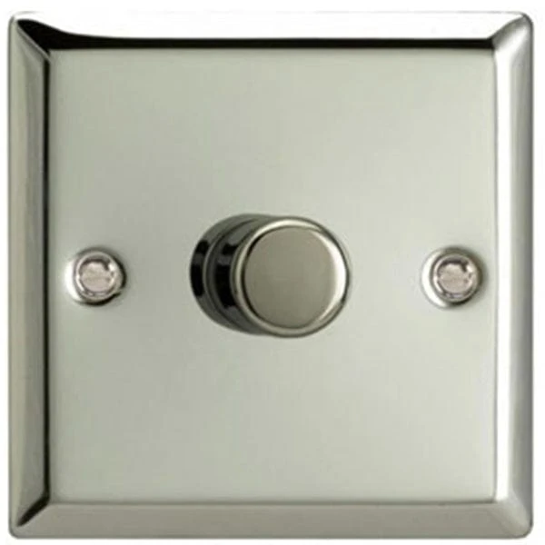 Varilight V-Pro Series Classic Polished Chrome (also known as Classic Mirror Chrome), 1 Gang (Single), 1 or 2 Way 400 Watt Push on/Push off (Trailing Edge) Dimmer with Polished Chrome Knob. Eliminate Dimmer Buzz For GLS Bulbs, GU10 Lamps, and LV Transformers Including Trailing Edge Loads.