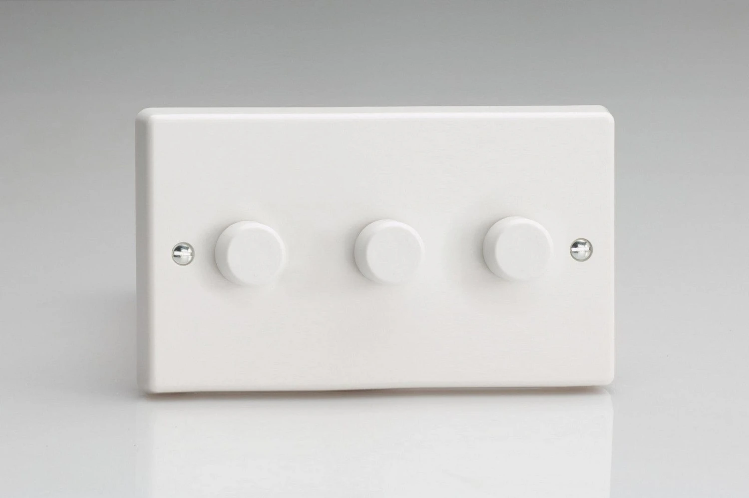 Varilight V-Pro Series Classic White Plastic, 3 Gang (Triple), 1 or 2 Way 3×300 Watt Push on/Push off (Trailing Edge) Dimmer with White Knobs. Eliminate Dimmer Buzz For GLS Bulbs, GU10 Lamps, and LV Transformers Including Trailing Edge Loads.